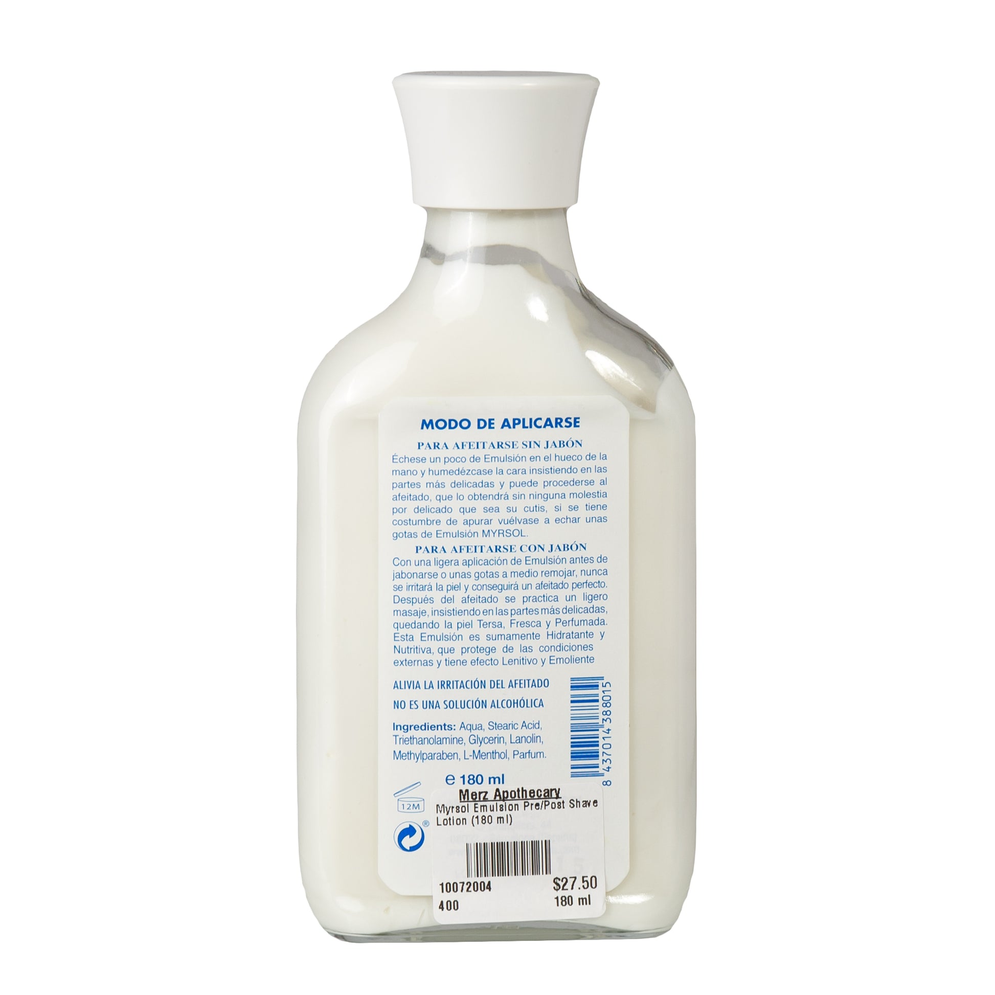 Myrsol's Shave Emulsion can be used before shaving to prepare and protect the skin, as well as after shaving to soothe and refresh. This alcohol-free formula moisturizes and tones the skin and has a light, fresh scent with just a touch of menthol.