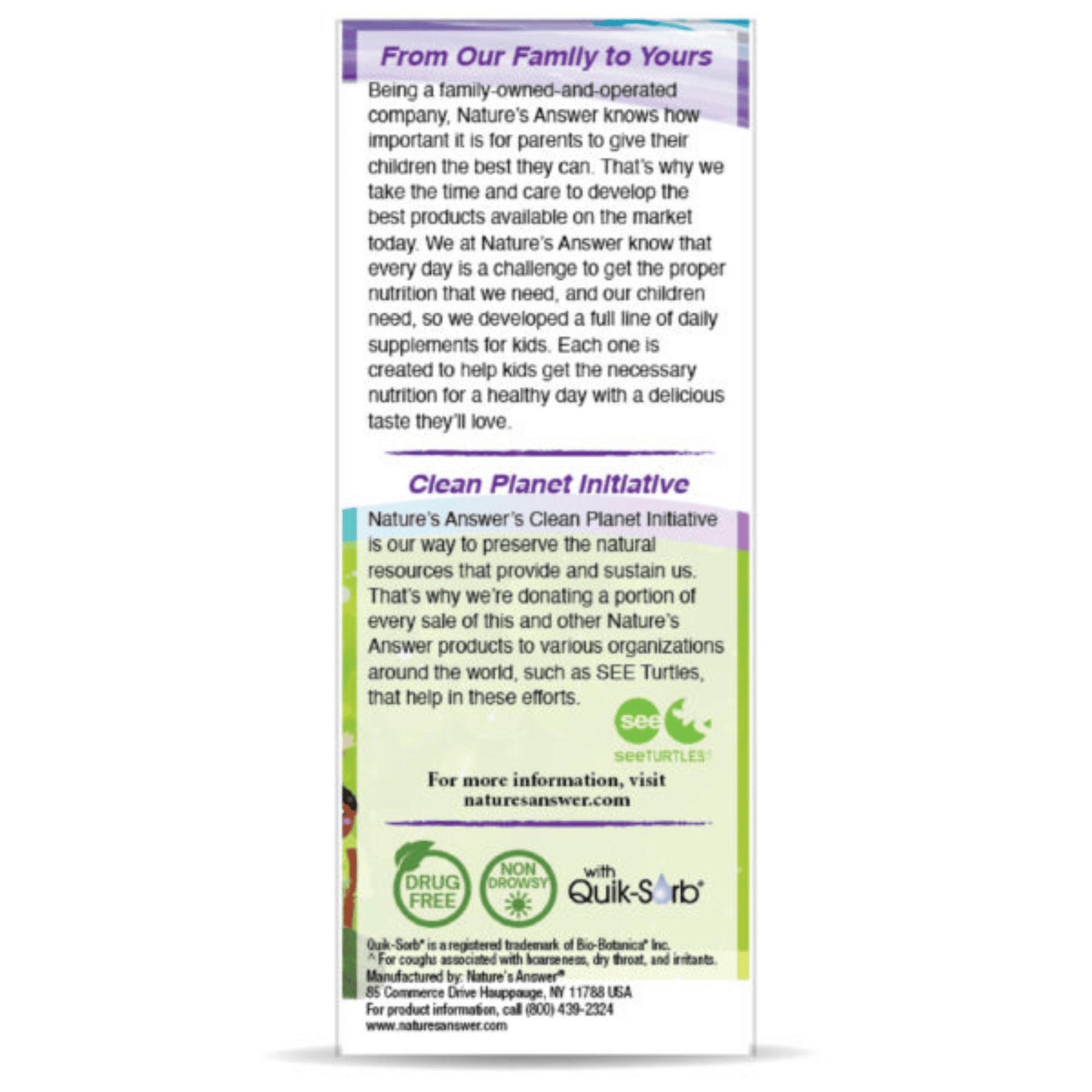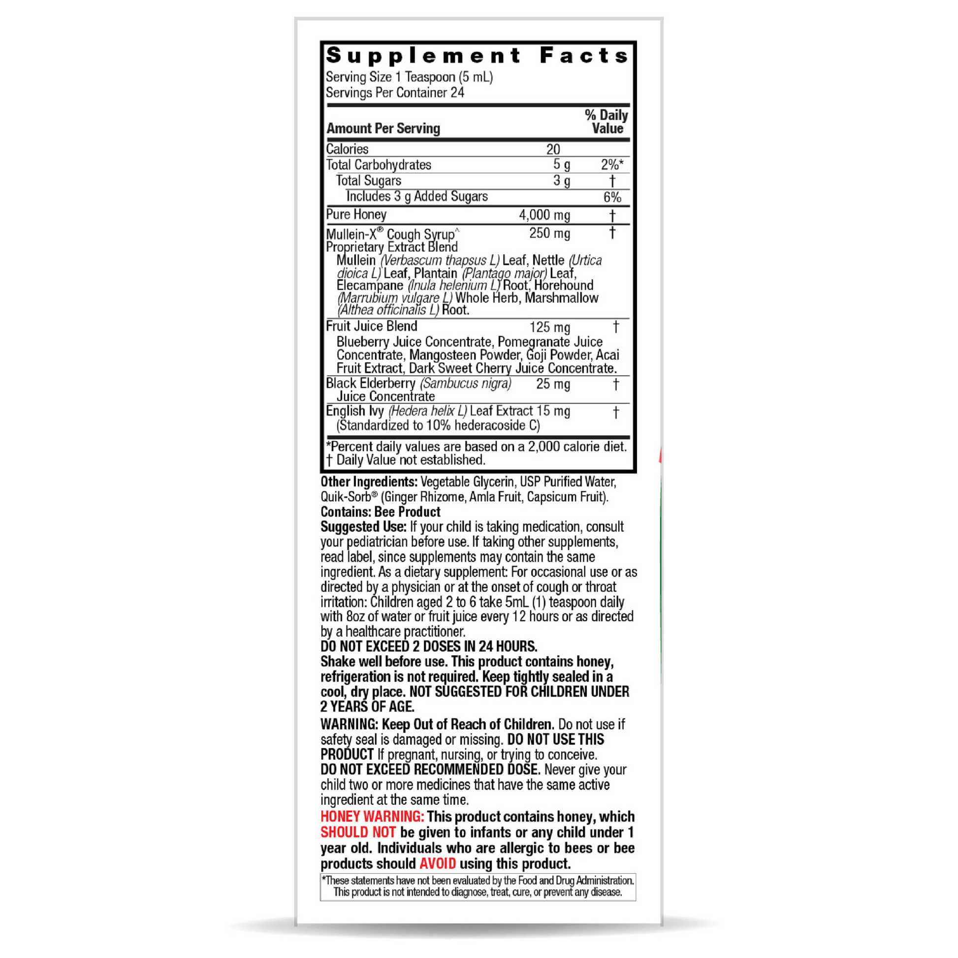 Suggested Use: If your child is taking medication, consult your pediatrician before use. If taking other supplements, read label, since supplements may contain the same ingredient. As a dietary supplement: For occasional use or as directed by a physician or at the onset of cough or throat irritation: Children aged 2 to 6 take 5 mL (1) teaspoon daily with 8 oz of water or fruit juice every 12 hours or as directed by a healthcare practitioner.