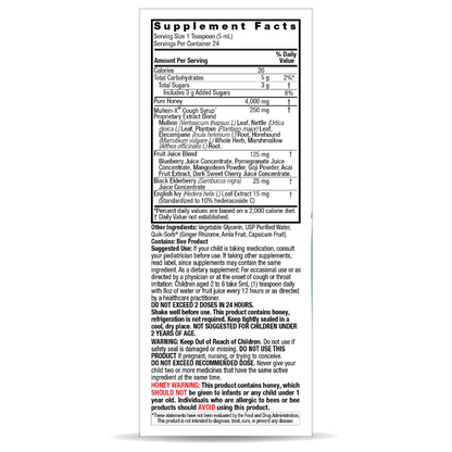 Introducing the all-natural mullein cough syrup for kids. This remedy will soothe your little ones with a gentle, delicious blend of honey and herbs that have been used for centuries for upper respiratory support. This mullein syrup for kids is specially formulated with a proprietary blend of herbs including Mullein, Nettle, Plantain, Elecampane, Horehound, and Marshmallow that support your child’s upper respiratory health and mucus membranes. This mullein cough syrup also includes Black Elderberry for immune support and a delicious juice blend with blueberries, goji and acai. Say goodbye to harsh chemicals and synthetic ingredients, and hello to all-natural ingredients in this mullein cough syrup to help get the yucky stuff out and support your child’s wellness journey.