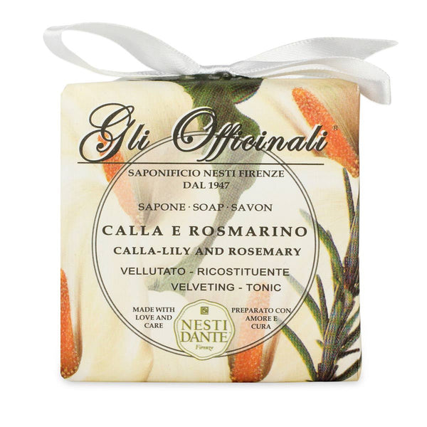 Nesti Dante's Gli Officinali line of natural soaps are enriched with the healing energy of pharmaceutical herbs to give bathing extra therapeutic benefits. The Calla Lily and Rosemary bar creates a velvety lather that tones and purifies the skin.Nesti Dante still prepares soaps in the traditional Italian manner: by cauldron baking. Though this process is more expensive and takes much longer (up to four days!), there is no substitute for making soaps of such a luxurious caliber. Taking the time and energy to create these soaps by hand ensures that Nesti Dante always delivers a superior product with high-quality raw materials. The production of Nesti Dante soap is strictly carried out with full respect for the environment. The soaps are natural and fully biodegradable, as well.
