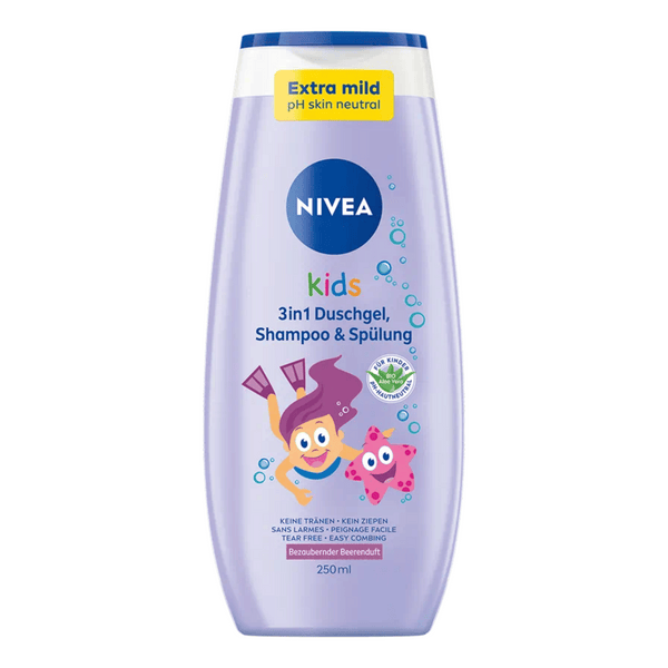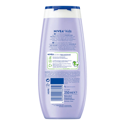 The Nivea Kids 3in1 shower gel, shampoo and conditioner ensures gentle cleansing of children's sensitive skin and hair. The extra mild formula with organic Aloe Vera & Chamomile contains 0% soap and does not cause tears. This kids shower gel is not only good for the skin, but also for the environment. The formula is 99% biodegradable (according to OECD or equivalent methods) and contains no microplastics. The bottle is made from 97% recycled material, apart from the cap and label. The conditioner makes the hair soft and combing it child's play. Since it's of course about more than just care for your little ones, the enchanting berry scent makes bath time fun.