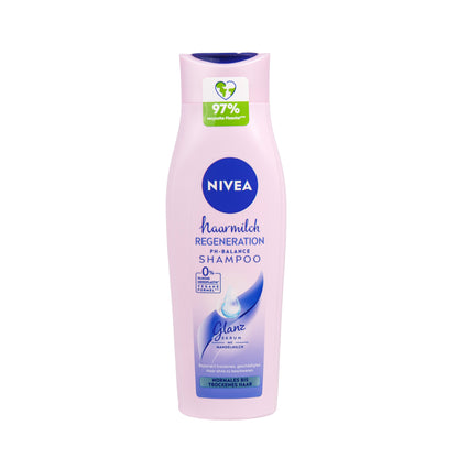 Nivea Hair Milk Regeneration Shampoo regenerates dry, damaged hair and gives it a natural shine. The new formula with Nivea Shine Serum and now with almond milk provides intensive care and does not weigh down the hair. The hair milk shampoo protects normal to thick hair from further damage. Since the Regenerating Shampoo harmonizes with the natural pH of the hair and scalp, it cleans particularly gently without irritating the scalp. The regenerating shampoo from Nivea makes dry hair shine again!