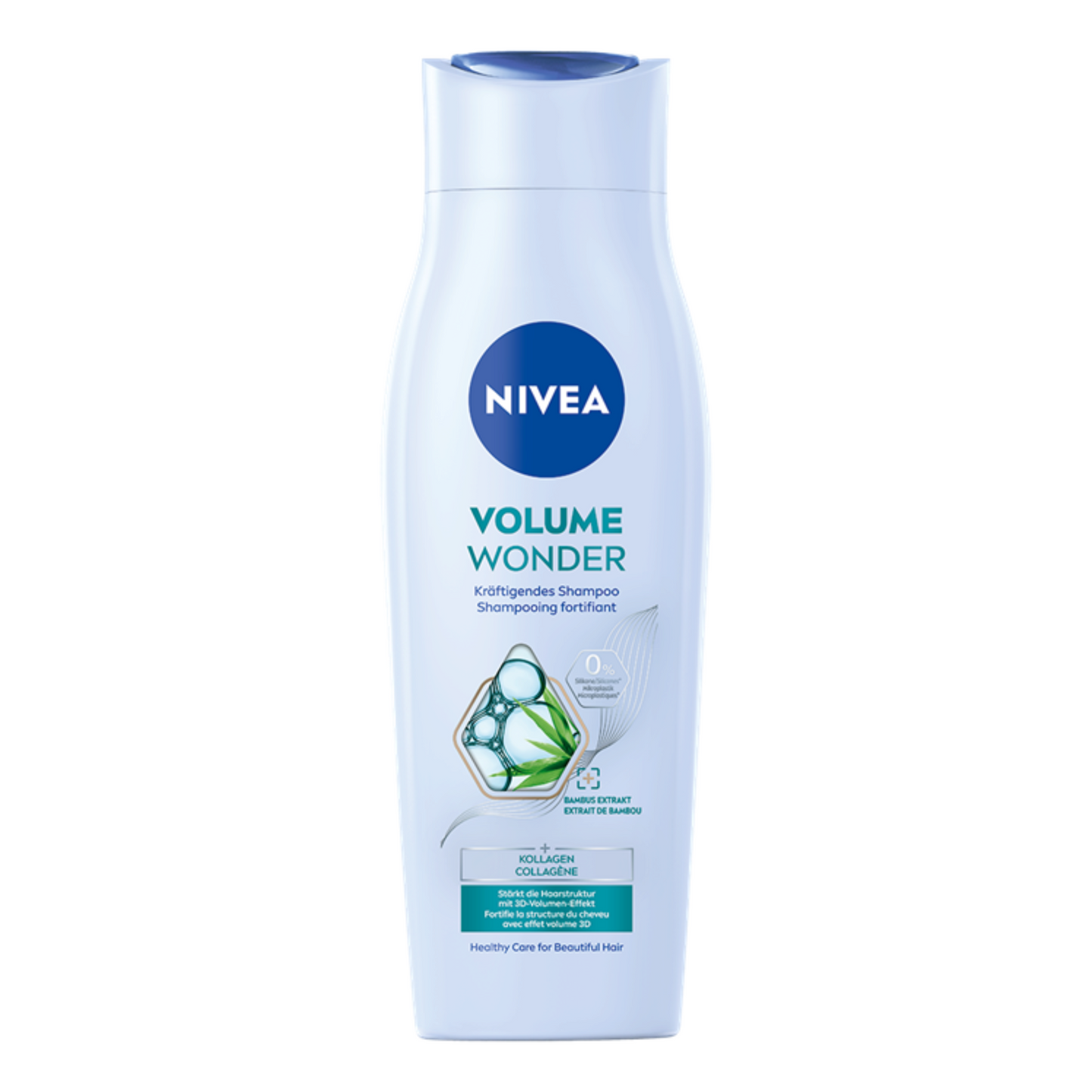 Discover the Volume Wonder Shampoo for an immediate 3D volume effect. The strengthening shampoo with highly effective collagen and natural bamboo extract ensures strengthened, powerful and beautiful hair. For optimal, healthy hair care and naturally beautiful hair: Volume Wonder Strengthening Shampoo from NIVEA As different as the hair types are, so are the needs. NIVEA therefore offers an extensive variety of shampoos for moisture, shine, radiant colors and repair. So you can find exactly the product you need for healthy-looking, strong and supple hair. The skin compatibility of the NIVEA Volume Wonder Strengthening Shampoo is dermatologically approved.