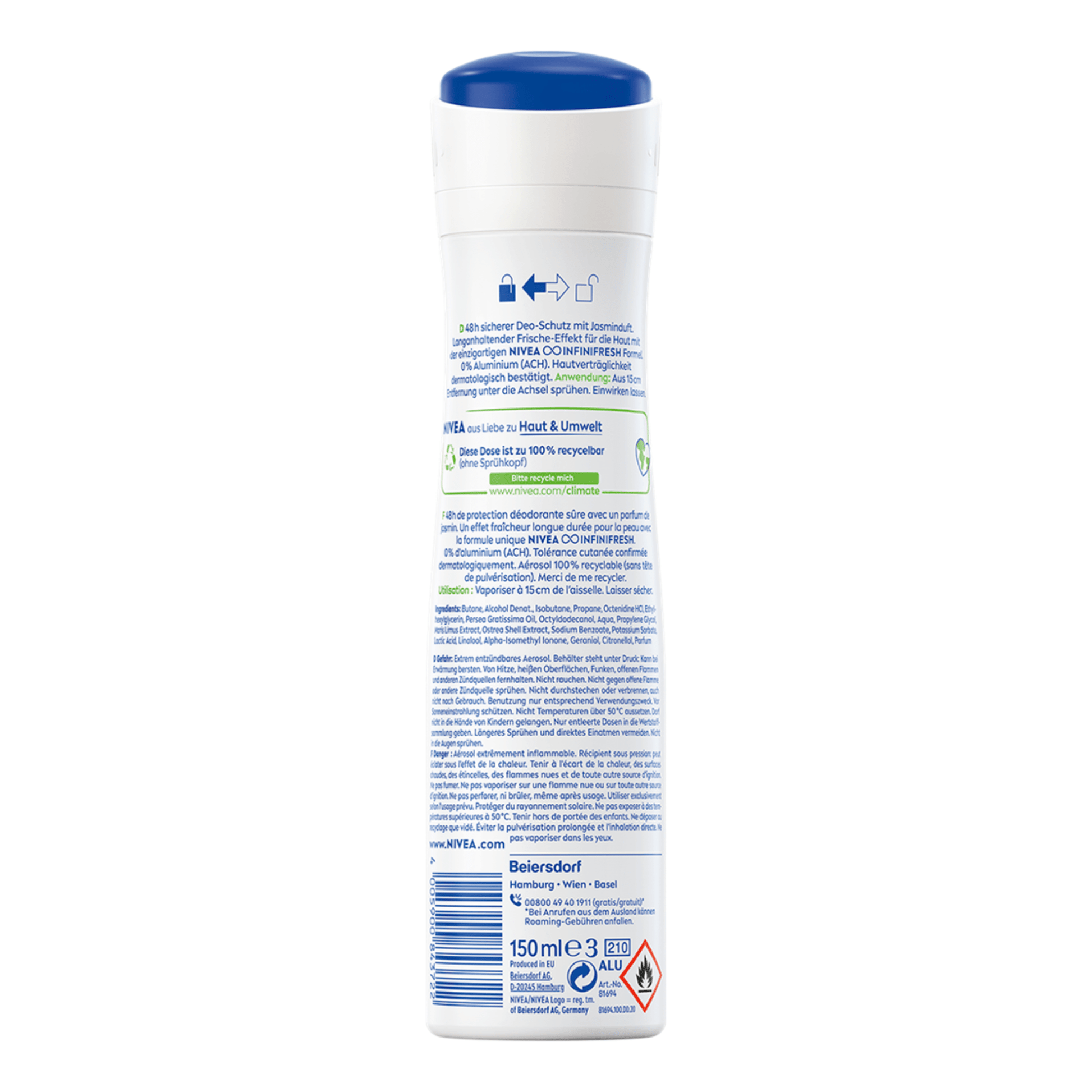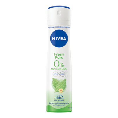 Always fresh! Nivea Fresh Pure Deodorant Spray offers a pure feeling of freshness and reliable deodorant protection all day long. The deodorant without aluminum (ACH) combines protection with gentle care. The unique INFINIFRESH formula ensures a long-lasting freshness effect for the skin. With a fresh Jasmine scent you will get 48 hours of effective deodorant protection and a feeling of freshness.