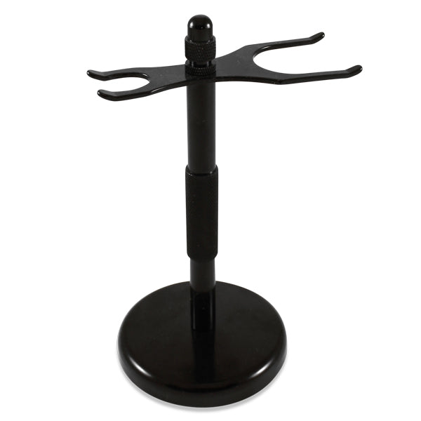 Parker's 2-prong shave stand holds both brush and razor, features weighted base rubber 'feet' on the base to prevent scratching, and a high luster black finish.