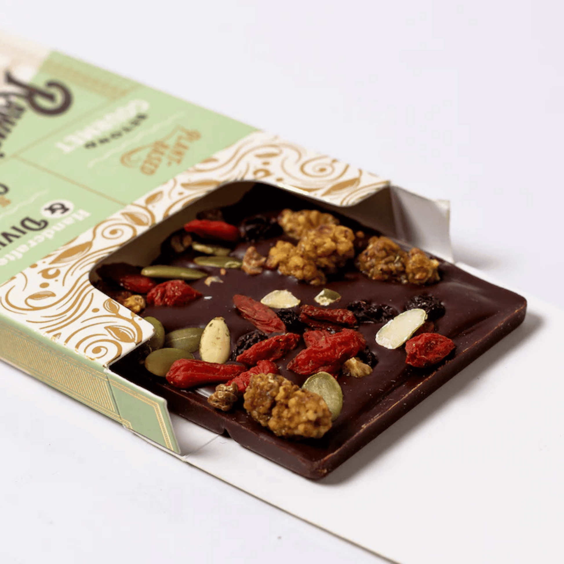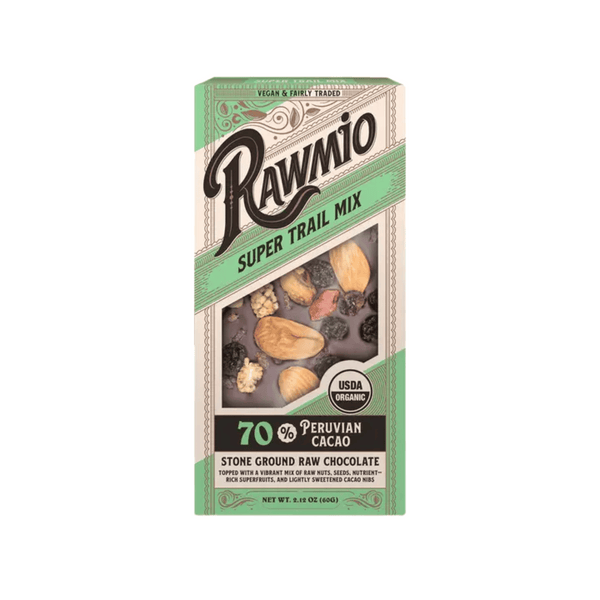 Rawmio's Trail Mix Raw Chocolate Bark combines two snacks that belong together into a decadent raw chocolate bark. A delicious trail mix made with some of your favorite nuts, seeds and dried fruits such as goji berries, mulberries, pumpkin seeds, almonds and others have been enrobed in Rawmio's delicious dark chocolate. A light sprinkling of sweet cacao nibs transforms the best of both worlds into one tasty bite. 70% stone ground raw chocolate topped with a vibrant mix of raw nuts, seeds, nutrient-rich superfruits, and lightly sweetened cacao nibs.