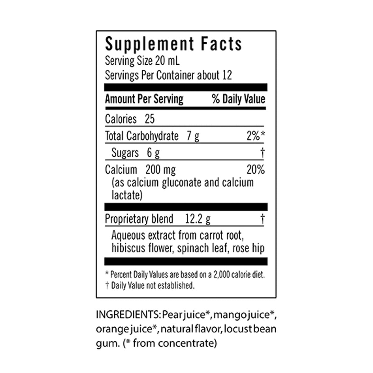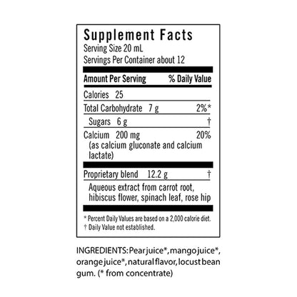 Aqueous Extract From Carrot Root, Hibiscus Flower, Spinach Leaf, Rose Hip, Pear Juice, Mango Juice, Orange Juice, Natural Flavor, Locust Bean Gum.