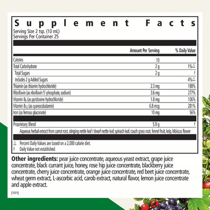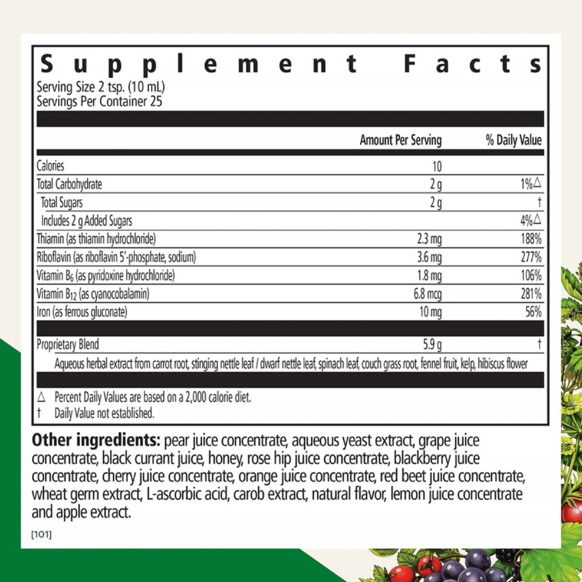 Aqueous Extract From Carrot Root, Stinging Nettle Herb, Spinach Leaves, Fennel Fruit, Couch Grass Root, Kelp, Hibiscus Flowers, Yeast (Sacchomyces Cerevisiae) Extract, Rosehips Extract (From Rosa Canina L.), Wheat (Triticum Aestivum L.) Germ Extract, Pear Juice, Water, Grape Juice, Black Currrant Juice, Honey, Orange Juice, Blackberry Juice, Cherry Juice, Red Beed Juice, Ascorbic Acid (as Antioxidant), Natural Flavor.