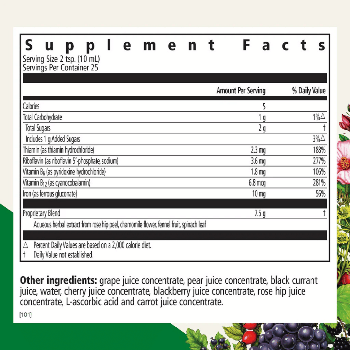 Aqueous Extract From Rose Hips (Rosa Canina L), Chamomile Flowers, Fennel Fruit, Spinach Leaves, Grape Juice, Pear Juice, Black Currant Juice, Water, Cherry Juice, Blackberry Juice, Carrot Juice, Ascorbic Acid (as Antioxidant).