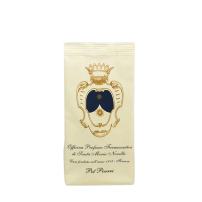 Pot Pourri is a mix a leaves, roots, blossoms and buds that spontaneously grow in the Tuscan Hills maquis. One of the most iconic and appreciated of the Officina's products, it has been crafted in their workshop for over three centuries. This mixture  typical of the Tuscan hills emanates Officina Profumo Farmaceutica di Santa Maria Novella's signature, traditional fragrance. 100 g refill sachet.