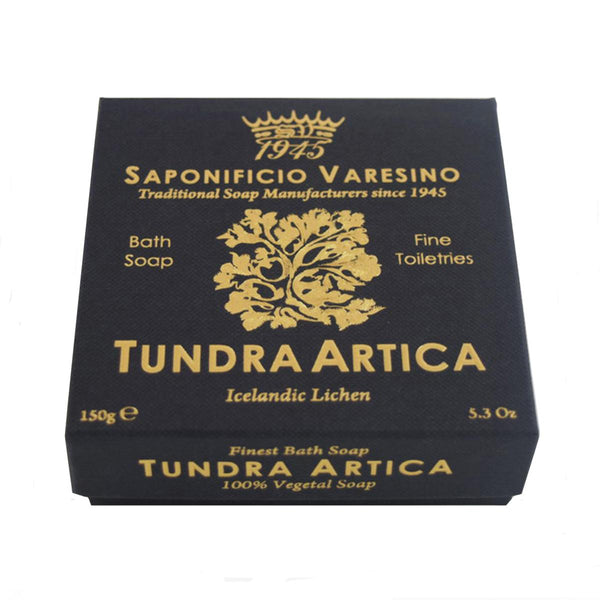 Bath soap placed in an elegant cardboard box engraved with metallic foil. The inner soap bar is gently wrapped with a thin printed tissue.The fragrance perfectly matches the one used for Tundra Artica Shaving Soap.Top Notes: Oud, Cedarwood, TangerineHeart Notes: Cashmeran, Rose, PatchouliBase Notes: Amber, Sandalwood, Leather100% Vegetable Soap ? Palm Free