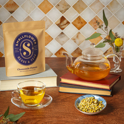 Chamomile - (Matricaria recutita) was coined by the ancient Greeks as “ the apple of the earth,” and “the sun on the ground”, likely due to its subtle fruity fragrance and lovely yellow daisy-like flowers. Chamomile is a member of the Asteraceae family, growing up to 24” high in temperate climates around the world. The Chamomile we know to be almost synonymous with herbal tea is Matricaria recutita, or German Chamomile. This beloved herb is as ancient as it is mighty, known and used for thousands of years the world over, from the ancient Greeks and early Native Americans to countless households today. It was even found in scrapings of Neanderthal teeth 50,000 years old! Chamomile is a gentle, bitter herb, perfect for keeping digestion humming along and the nervous system calm and relaxed. Chamomile makes a lovely after dinner tea all on its own or paired with peppermint and fennel. It can also stand alone very well as a calming and delicious sleep tea or paired with a bit of lavender.