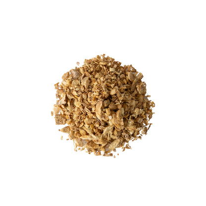 Ginger (Zingiber officinalis) is a plant in the Zingiberaceae family that is native to southeast Asia and is grown in tropical climates around the world. It’s a reedy, leafy perennial that grows up to 2 feet, shooting up a tall flower stem in the spring. The yellow or white flower grows from a scallopy spike on the tip of the stem that looks a bit like a small pink pineapple. The root system grows from a fleshy rhizome, which is the part of the plant commonly used in culinary and medicinal practices. Ginger is a warming and stimulating herb, supporting the immune system, circulatory system and digestion. Certain volatile oils contained in Ginger root are believed to have soothing, anti-spasmotic effects that can help ease occasional pain and nausea related to pregnancy and menstruation, common indigestion or travel sickness. Dried Ginger root can be used to make syrups, decocted for a warm and spicy tea, tinctured or ground for use in topical or culinary applications.