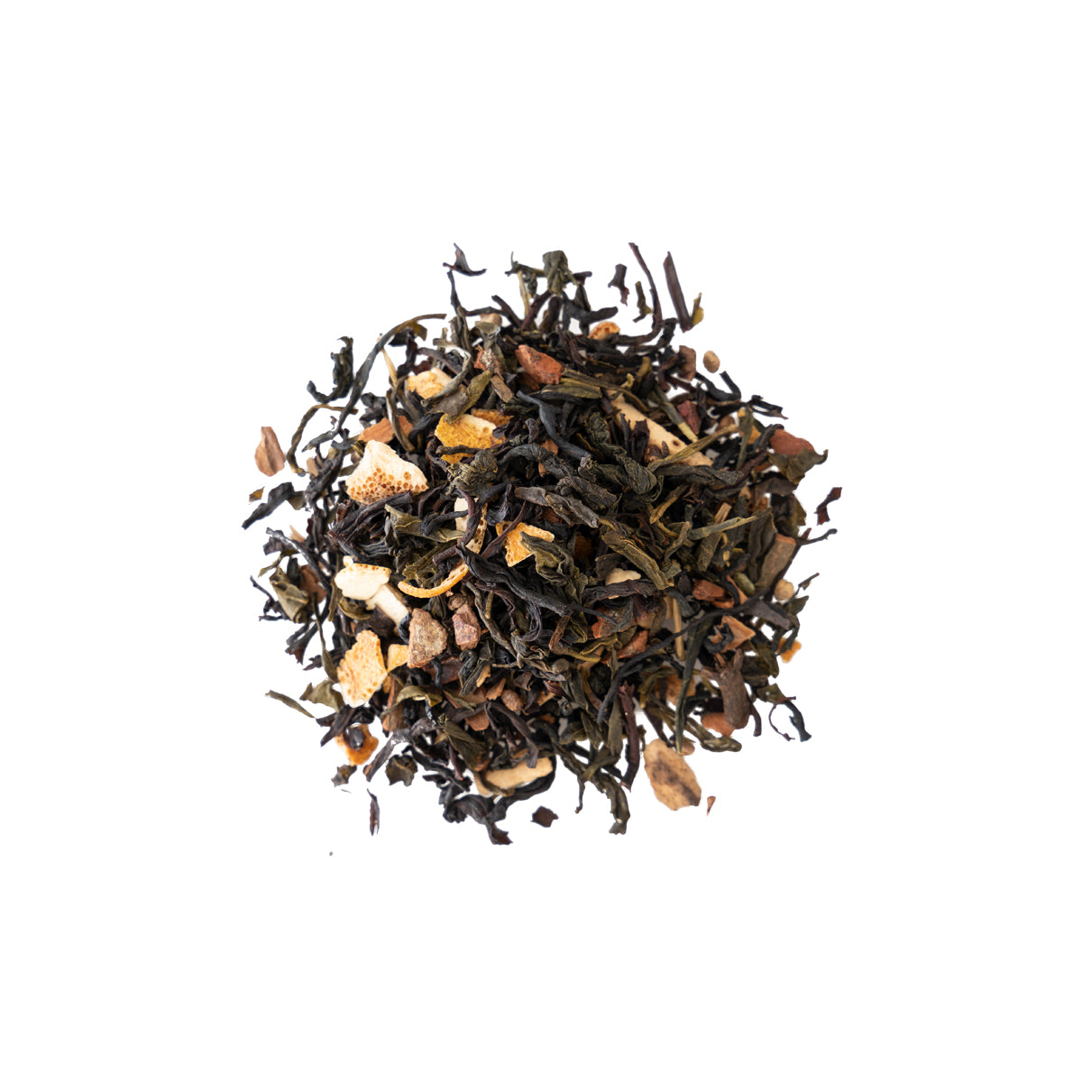 Green tea from India, China and Japan, black tea from India, cinnamon bits, orange peel, cardamom seeds, cardamom husks, cloves and flavor.