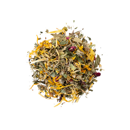 Peppermint, Cleavers, Calendula, Strawberry Leaf, Thyme, Blackberry Leaf, Linden Flower, Lemon Balm, Marjoram, Spruce Tips, Raspberry Leaf, Nettle Leaf, Speedwell, St. John’s Wort, Yarrow, Lady’s Mantle, Rose Petal, Daisies, Violet Herb, Chamomile Flower, Cowslip, Small Flowered Willow Herb