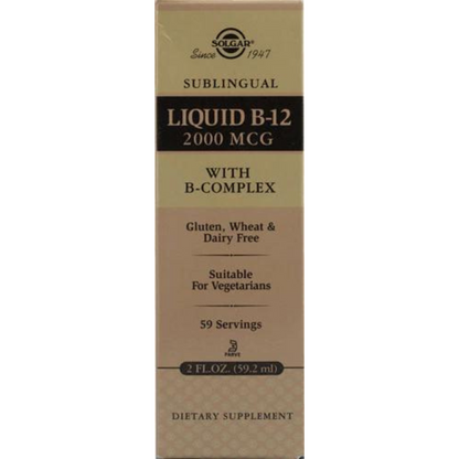Solgar's Sublingual Liquid B-12 2000 mcg with B-Complex is designed to provide an advantage over conventional B-Complexes by offering an easy-to-use liquid formula for anyone who has difficulty in swallowing tablets or capsules. Our liquid formula also does not need to be broken down in the digestive tract as compared to a standard pill.