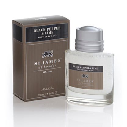 Formulated with only the finest natural oils and extracts, the Post-shave Gel cools, soothes, and hydrates your skin after shaving. A little goes a long way!Black Pepper and Lime:A modern classic grounded in Woody notes, Peppercorn oil, and infused with Persian lime. Perfectly clean, refreshing, and sophisticated.Created and manufactured in England, St James of London products are alcohol-free, paraben-free and sulfate-free.