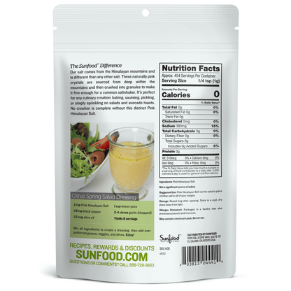 Sunfood Superfood's salt comes from the Himalayan mountains and is different than any other salt. These naturally pink crystals are sourced from deep within the mountains and then crushed into granules to make it fine enough for a common saltshaker. It's perfect for any culinary creation: baking, sauteing, pickling, or simply sprinkling on salads and avocado toasts. No creation is complete without this distinct Pink Himalayan Salt.
