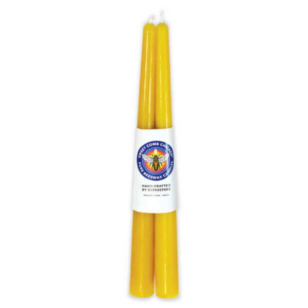 These tall tapered candles are made of beeswax and nothing else. Beeswax candles produce negative ions when burned which help neutralize pollutants in the air. This helps eliminate dust, odors, and mold in the atmosphere, easing allergy and asthma symptoms and may improve breathing for anyone nearby. Beeswax candles are more about cleaning and freshening the air than they are about masking odors with heavy perfumes.