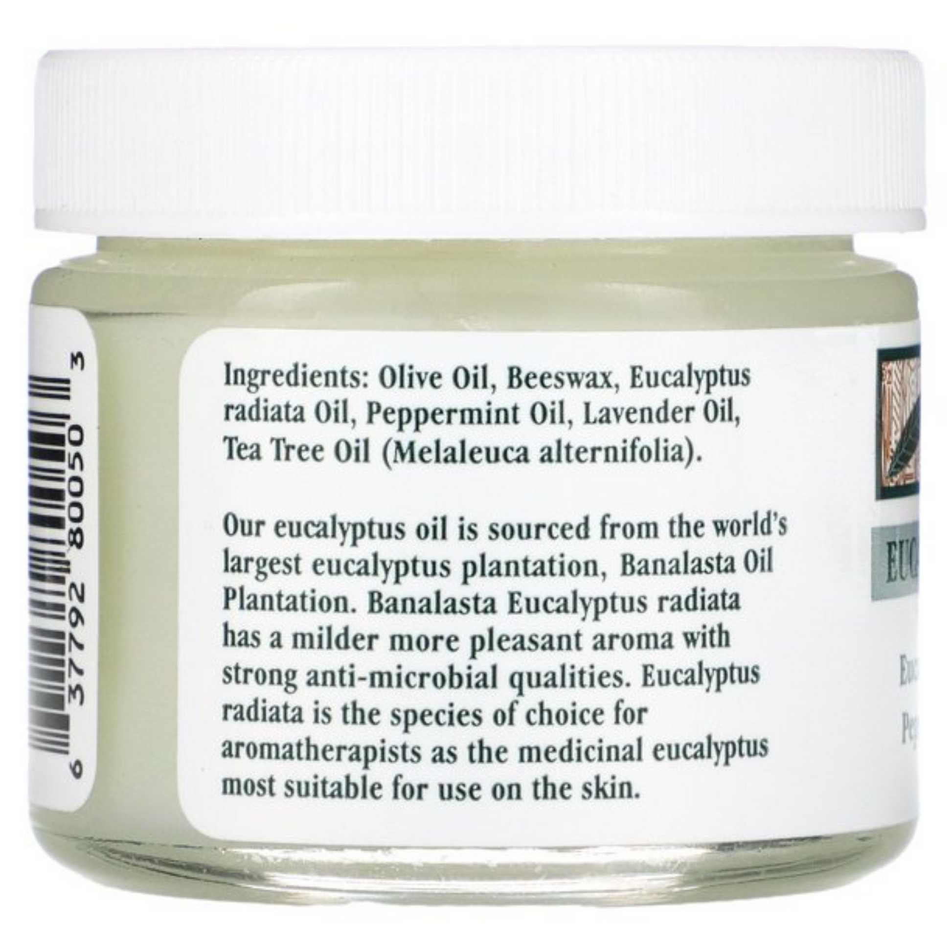 Olive Oil, Beeswax, Eucalyptus radiata oil, Peppermint oil, Lavender oil, (Tea Tree) leaf oil Melaleuca alternifolia.
