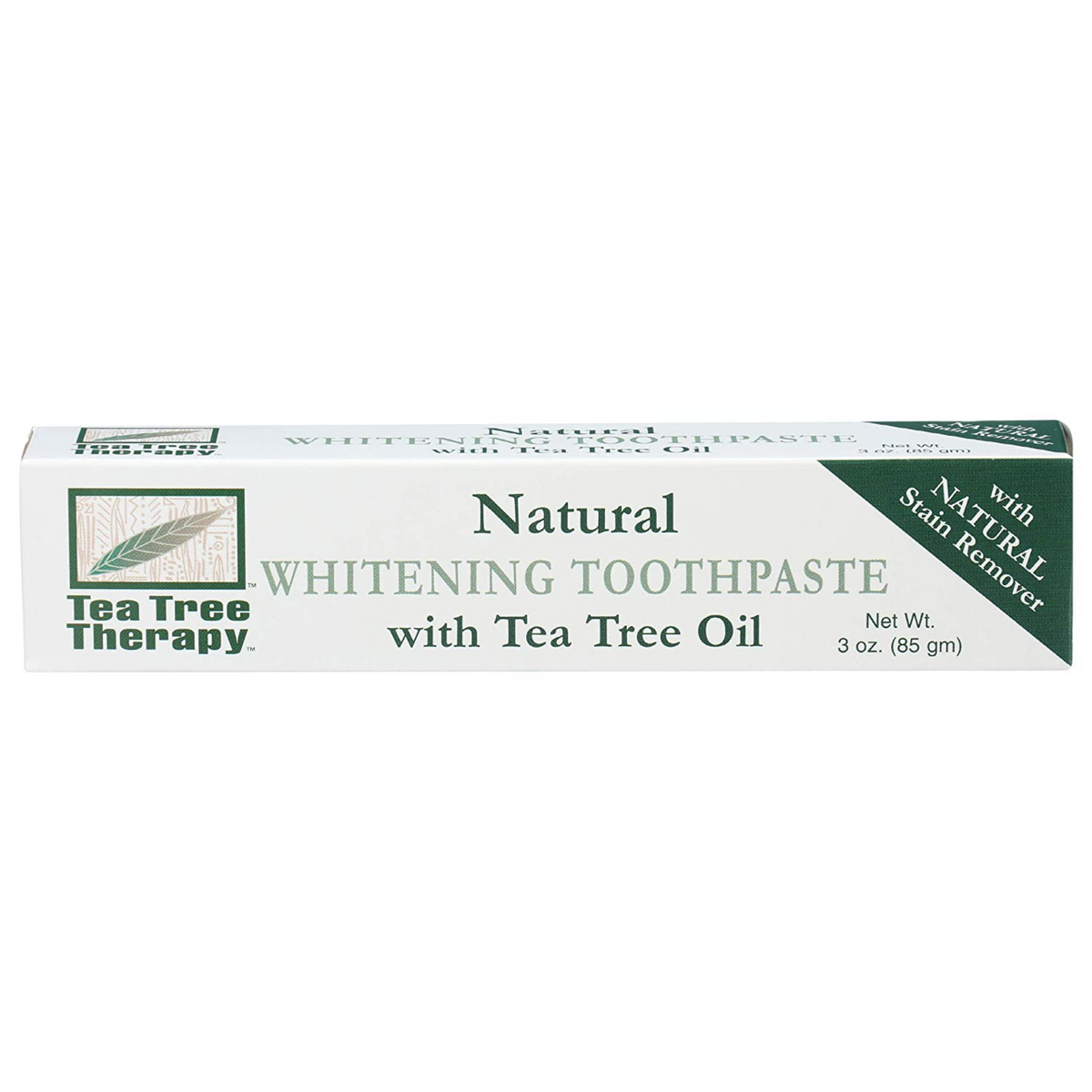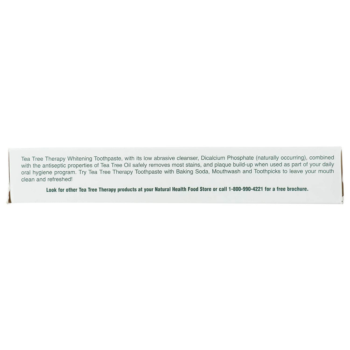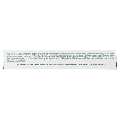 Tea Tree Therapy Whitening toothpaste, with its low abrasive cleanser, Dicalcium Phosphate (naturally occurring), combined with the antiseptic properties of tea tree oil safely removes most stains, and plaque buildup when used as part of your daily oral hygiene program. Fluoride free, No SLS.