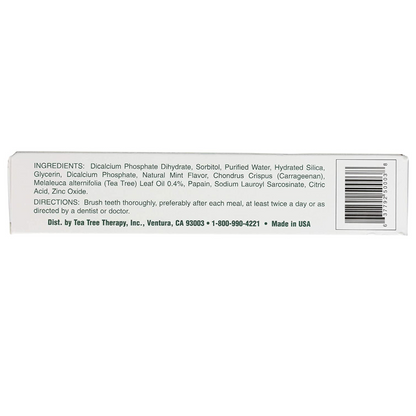 Dicalcium Phosphate Dihydrate, Sorbital, Purified Water, Hydrated Silica, Glycerin, Dicalcium Phosphate, Natural Mint Flavor, Chondrus Crispus (Carrageenan), Melaleuca alternifolia (Tea Tree) leaf oil 0.4%, Papain, Sodium lauroyl Sarcosinate, Citric Acid, Zinc Oxide.