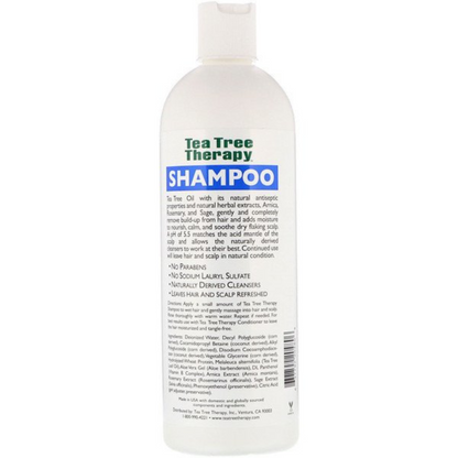 Tea Tree Therapy Shampoo with Tea Tree Oil has natural herbal extracts. Arnica, Rosemary, and Sage that gently and completely remove build-up from hair and adds moisture to nourish, calm, and soothe dry flaking scalp. It provides gentle cleansing for all hair types and leaves no chemical residue. A PH of 5.5 matches the acid mantle of the scalp and allows the naturally derived cleansers to work at their best.