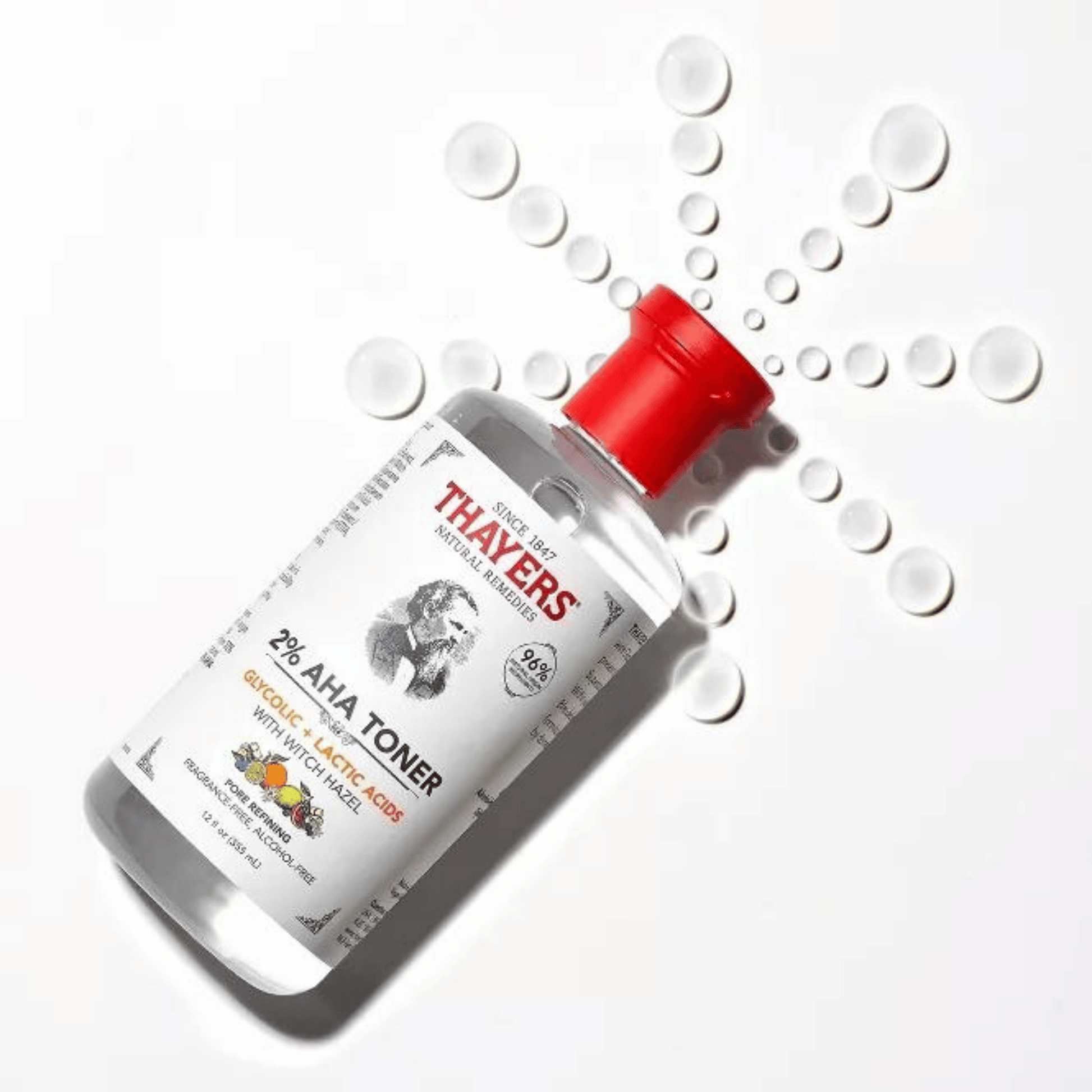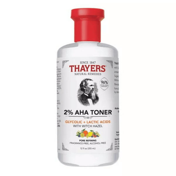 Thayers 2% AHA Toner is formulated with Glycolic and Lactic Acids that are present in the Orange, Lemon, Bilberry, Sugarcane, Sugar Maple extracts. This unique, proprietary blend also contains certified organic, non-distilled Witch Hazel that’s grown exclusively for Thayers on a family farm in Fairfield County, Connecticut. By avoiding distillation of their Witch Hazel, Thayers is able to preserve the naturally-occurring, beneficial tannins, which are known to offer antioxidant and antibacterial benefits, and bring about a natural glow. Within just 1 week, pores will look refined. Blended with Witch Hazel, the alcohol-free forrmula is very gentle and had been tested by dermatologists for safety.