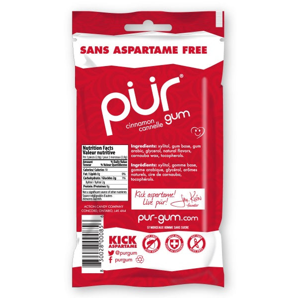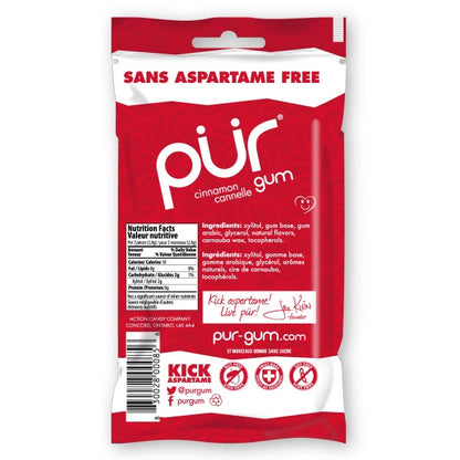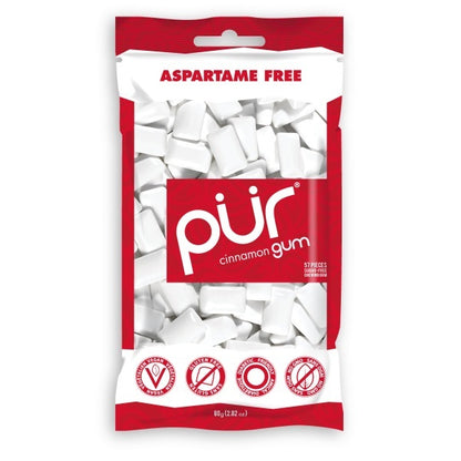 PUR Gum is made with the highest quality ingredients available, and contains no chemicals or artificial sweeteners. Instead, PUR Gum is sweetened with xylitol, a natural sweetener derived from corn fibers grown in Europe. Try the cinnamon flavor for a deliciously spicy kick!What makes PUR so pure?- Naturally sweetened with xylitol- Gluten-free- Vegan- Non-GMO- Diabetic-friendly- Nut-free and soy-free- Dairy-free- Safe for pregnant moms- Swiss-made