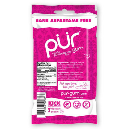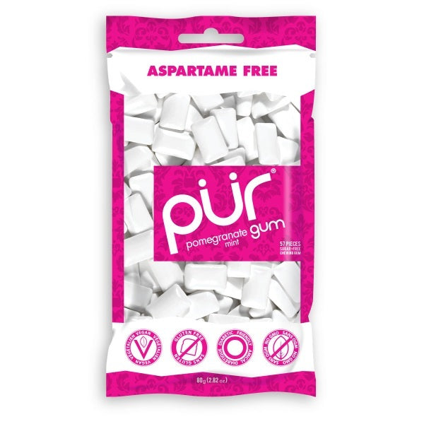 PUR Pomegranate Mint gum captures pomegranate, nature's super fruit, and fuses it with the cooling sensation of mint. Sweetened with Xylitol, P?R Pomegranate Mint is a great tasting gum that KICKS ASPARTAME!What makes PUR so pure?- Naturally sweetened with xylitol- Gluten-free- Vegan- Non-GMO- Diabetic-friendly- Nut-free and soy-free- Dairy-free- Safe for pregnant moms- Swiss-made