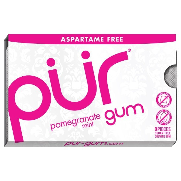 Pomegranate Mint gum captures pomegranate, nature's super fruit, and fuses it with the cooling sensation of mint. Sweetened with Xylitol, PUR Pomegranate Mint is a great tasting gum that KICKS ASPARTAME.What makes PUR so pure?- Naturally sweetened with xylitol- Gluten-free- Vegan- Non-GMO- Diabetic-friendly- Nut-free and soy-free- Dairy-free- Safe for pregnant moms- Swiss-made