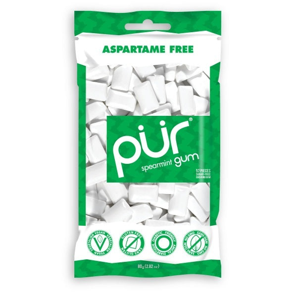 PUR Spearmint gum refreshes your breath with the clean crisp taste of spearmint while providing the antioxidant benefits of white tea. Sweetened with Xylitol, enjoy a great tasting gum that KICKS ASPARTAME!What makes PUR so pure?- Naturally sweetened with xylitol- Gluten-free- Vegan- Non-GMO- Diabetic-friendly- Nut-free and soy-free- Dairy-free- Safe for pregnant moms- Swiss-made
