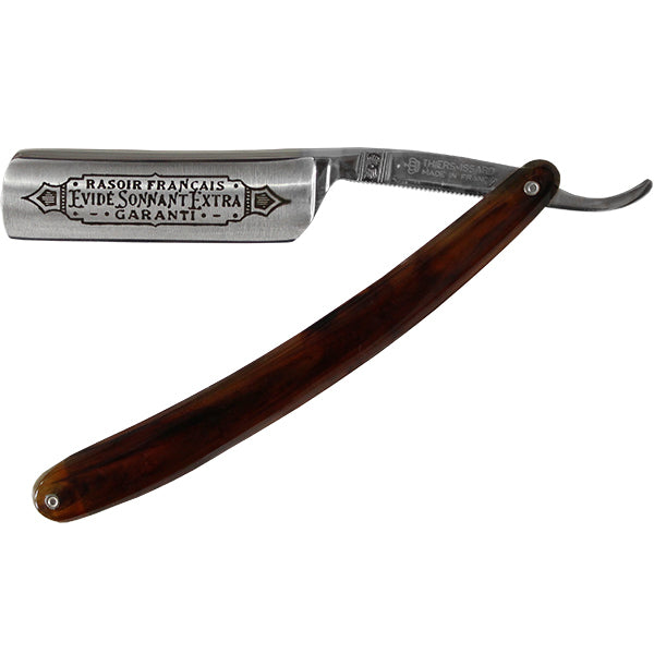 A superior quality straight razor, the 275 1196 is both a pleasure to look at and use. Great for beginners, it is lightweight, well-balanced, and easy to strop.Blade Type: Fully hollow-ground C135 carbon steel; round nose, razor name in black, and a satin finish.Blade Size: 6/8''Scale: Sturdy plastic with a deep amber, faux tortoiseshell look (variations occur, scale may differ from photo).Features: Jimps for a secure grip. Attractive ''Thiers Issard'' etching.Packaged in a leather pouch. Handmade in France. Comes pre-honed, so it's shave-ready.
