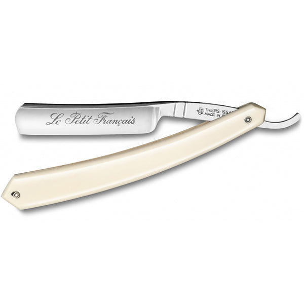 A superior quality straight razor, the 275 Petit Francais is both a pleasure to look at and use. Great for beginners, it is lightweight, well-balanced, and easy to strop.Blade Type: 1/2 hollow-ground C135 carbon steel; round nose, razor name in black, and a satin finish.Blade Size: 4/8''Scale: Sturdy plastic with a white, faux ivory look.Features: Jimps for a secure grip. Attractive ''Thiers Issard'' etching.Packaged in a leather pouch. Handmade in France. Comes pre-honed, so it's shave-ready.