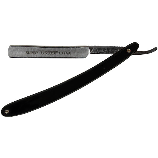 A superior quality straight razor, the Super Gnome is a true barber's tool, and is excellent for detail work if you have a partial or shaped beard. Great for beginners, it is lightweight, well-balanced, and easy to strop.Blade Type: 1/2 hollow-ground C135 carbon steel with attractive etching and a satin finish.Blade Size: 2/8''Scale: Sturdy plastic with a black, faux ebony look.Features: Jimps for a secure grip.Packaged in a leather pouch. Handmade in France.