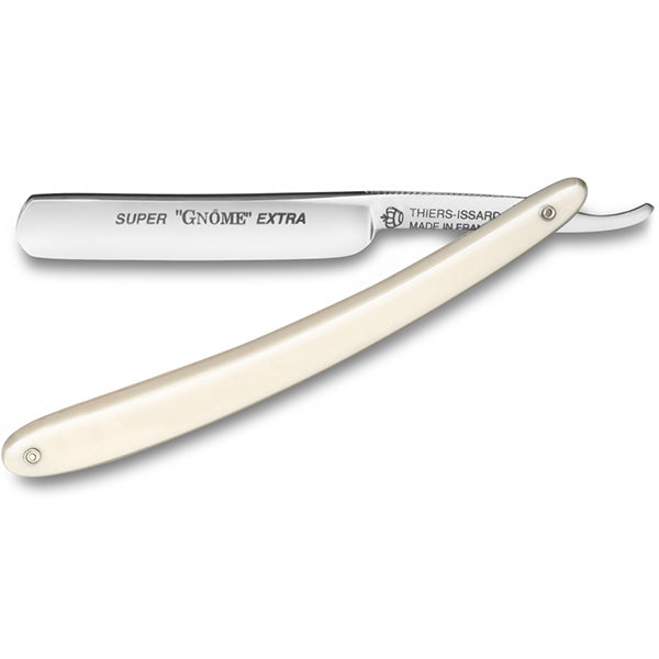 A superior quality straight razor, the Super Gnome is a true barber's tool, and is excellent for detail work if you have a partial or shaped beard. Great for beginners, it is lightweight, well-balanced, and easy to strop.Blade Type: 1/2 hollow-ground C135 carbon steel; round nose, razor name in black, and a satin finish.Blade Size: 3/8''Scale: Sturdy plastic with a white, faux ivory look.Features: Jimps for a secure grip. Attractive ''Thiers Issard'' etching.Packaged in a leather pouch. Handmade in France.