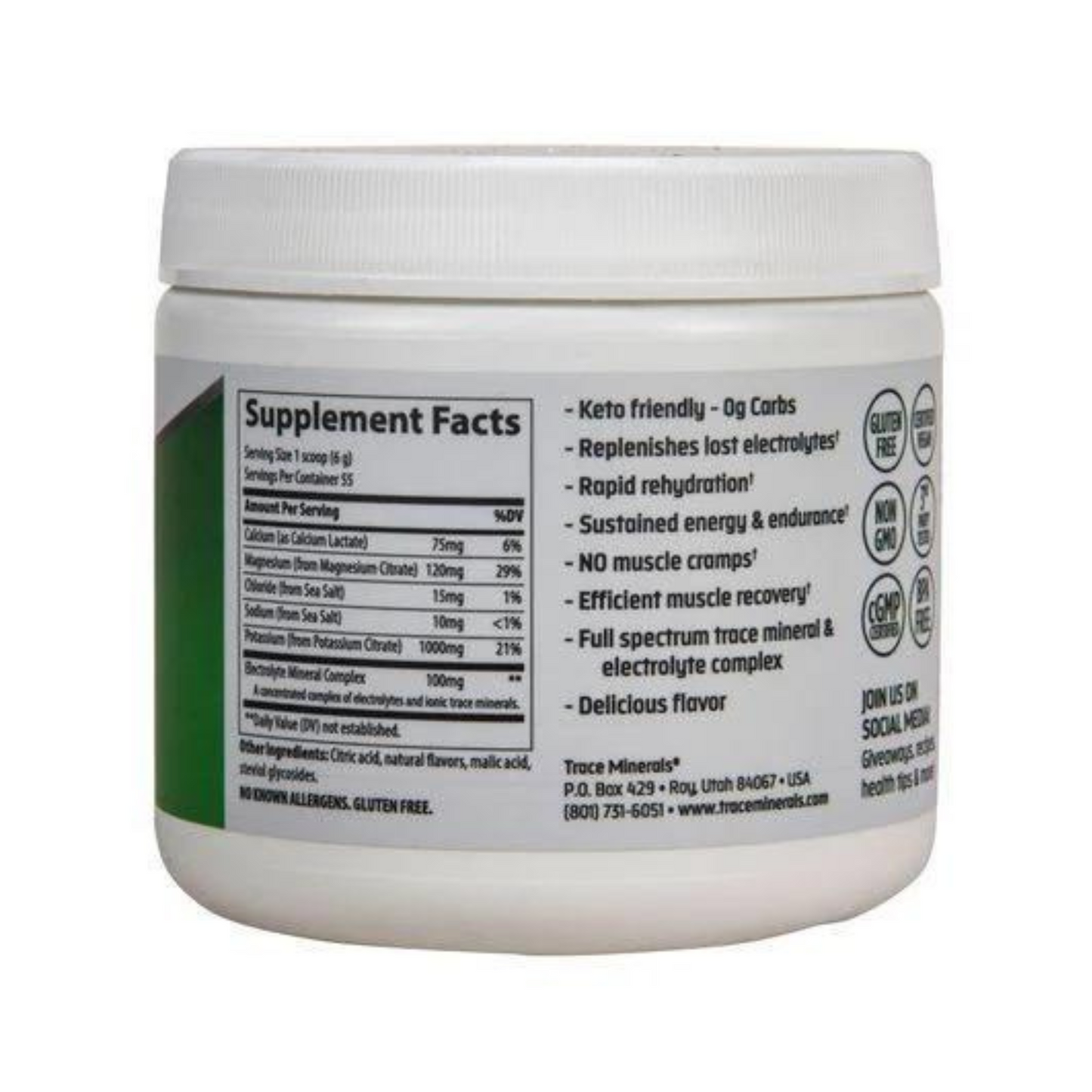 Maintain essential hydration and support energy and endurance while sticking to your diet goals with Trace Minerals Keto Electrolyte Powder. This lemon-lime flavored powder is free of sugar and maltodextrin. It delivers calcium, magnesium, chloride, sodium and potassium plus a complex of electrolytes and ionic trace minerals to rehydrate, replenish and energize. Keto Electrolyte Powder is a carb-free way to stay hydrated and stick to your keto lifestyle. Simply mix one scoop with 16 ounces of water and enjoy!