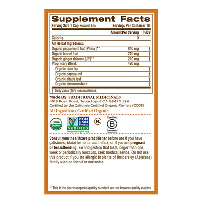 Peppermint leaf, sweet fennel seed, ginger rhizome, rose hip, papaya leaf, alfalfa leaf, cinnamon bark.
