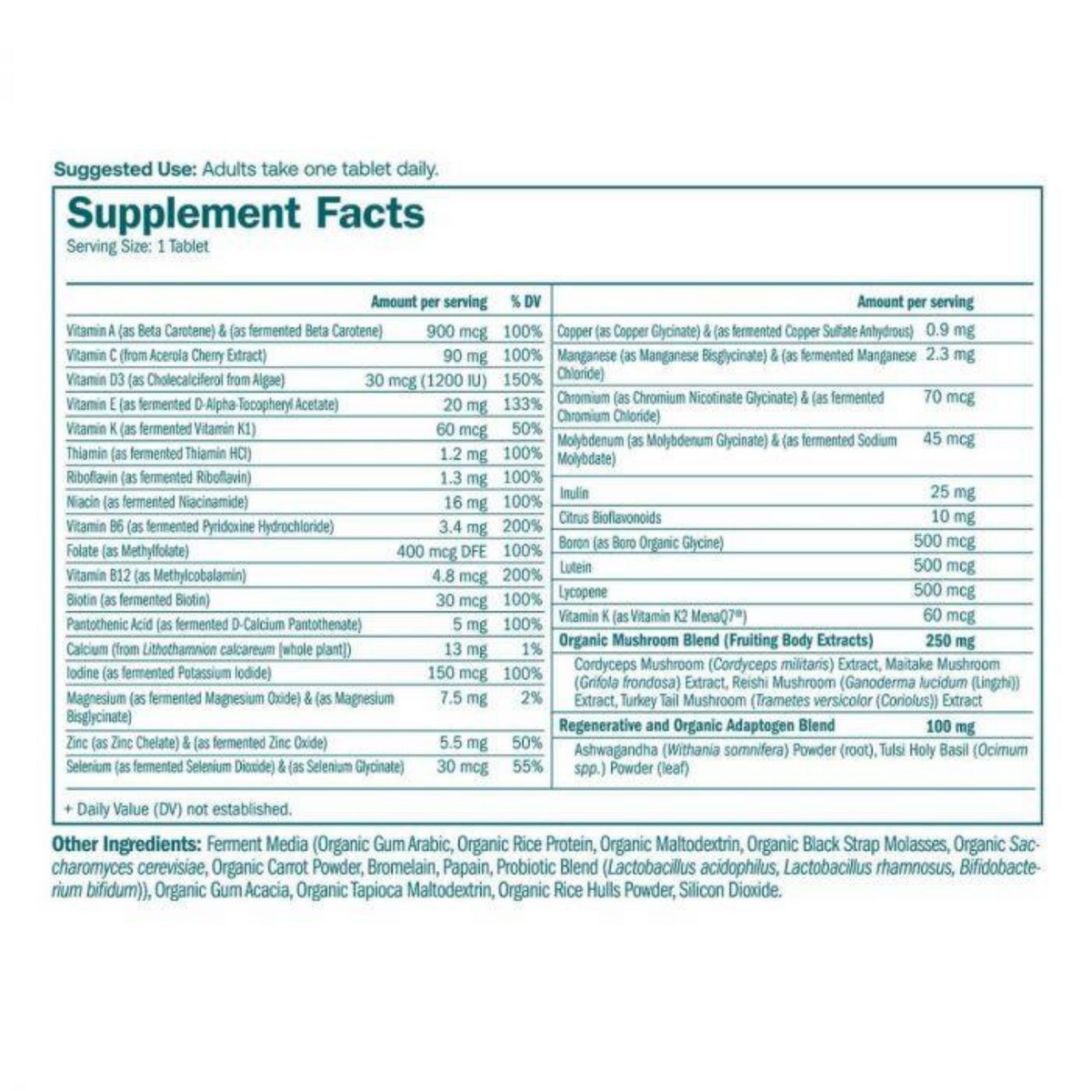 Beta-Carotene, Fermented Beta-carotene, Acerola Cherry (Vitamin C), Lithothamnium calcareum powder (Calcium), Algae (Vitamin D3), Fermented Vitamin E, Vitamin E (d-alpha-tocopheryl acetate), Fermented Vitamin K1, Vitamin K2, Fermented Thiamine, Fermented Riboflavin, Fermented Niacinamide, Fermented Vitamin B6, Methylfolate, Vitamin B12 (Methylcobalamin), Fermented Biotin, Fermented Pantothenic Acid, Fermented Magnesium, Magnesium Bisglycinate, Fermented Iodide, Fermented Zinc, Zinc Chelate, Fermented Selenium, Selenium Glycinate, Fermented Copper, Copper Glycinate, Fermented Manganese, Manganese Bisglycinate, Fermented Chromium, Chromium Nicotinate Glycinate, Fermented Molybdenum, Molybdenum Glycinate, Bororganic Glycine, Lycopene, Lutein, Prebiotics (Inulin), Citrus Bioflavonoids, Ashwagandha, Tulsi Holy Basil Cordyceps, Maitake, Reishi, Turkey Tail