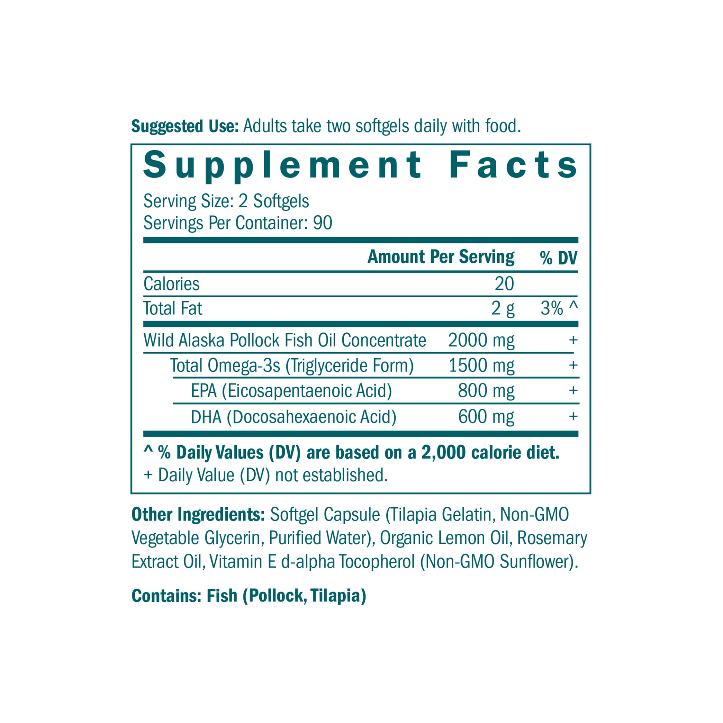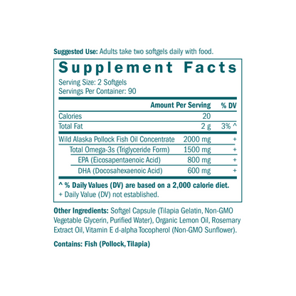 Other Ingredients: Softgel Capsule (Tilapia Gelatin, Non-GMO Vegetable Glycerin, Purified Water), Organic Lemon Oil, Rosemary Extract Oil, Vitamin E d-alpha Tocopherol (Non-GMO Sunflower).