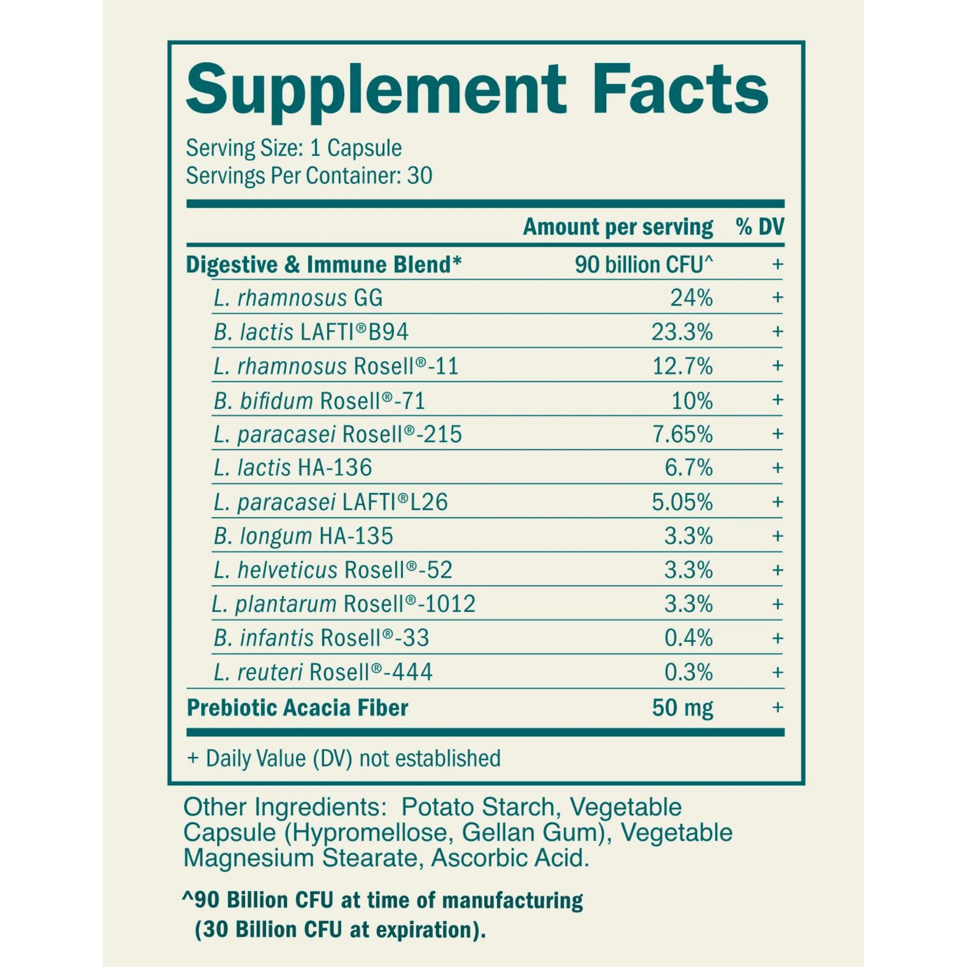 Lactobacillus rhamnosus Rosell-11, Lactobacillus rhamnosus GG, Lactobacillus plantarum Rosell-1012, Lactobacillus helveticus Rosell-52, Lactococcus lactis ssp. lactis HA-136, Lactobacillus paracasei Rosell-215, Lactobacillus reuteri Rosell-444, Lactobacillus paracasei Lafti L26, Bifidobacterium bifidum Rosell-71, Bifidobacterium longum HA-135, Bifidobacterium animalis ssp. lactis Lafti B94, Bifidobacterium infantis Rosell-33