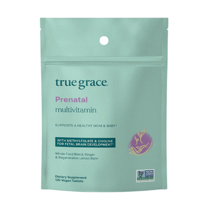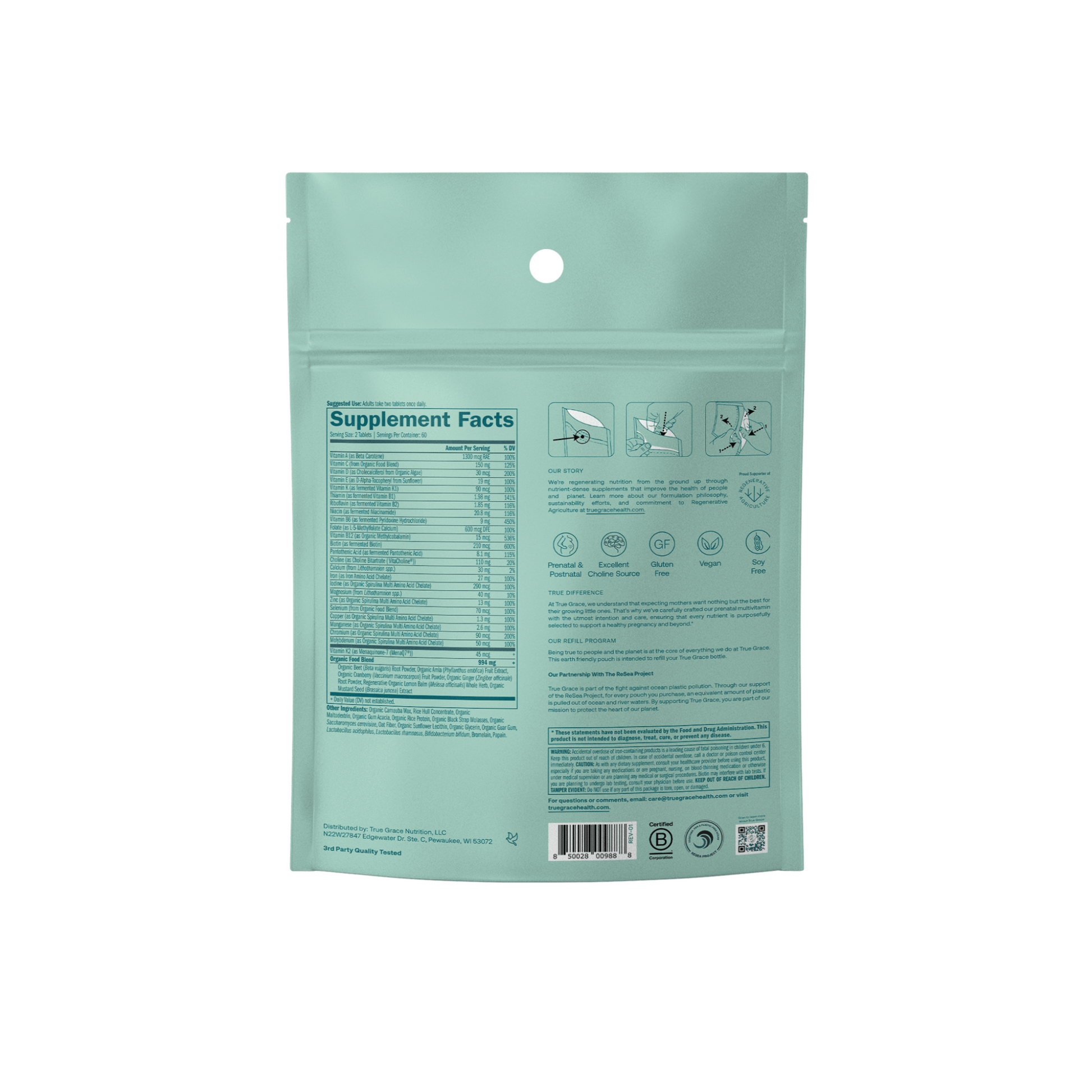 A daily multivitamin to support a healthy mom & baby. True Grace has made a prenatal vitamin that is for women during pre-conception, pregnancy, and lactation. This comprehensive multivitamin fits perfectly into your routine to support all your vitamin needs during pregnancy. Includes an organic whole food blend, 45 mcg per serving of Vitamin K2, 200% DV of Vitamin D3 for pregnant women, regenerative organic lemon balm & organic ginger and Choline to support central nervous system development. You can refill your True Grace Prenatal Vitamin Bottle twice with this 120 count Refill Pouch.
