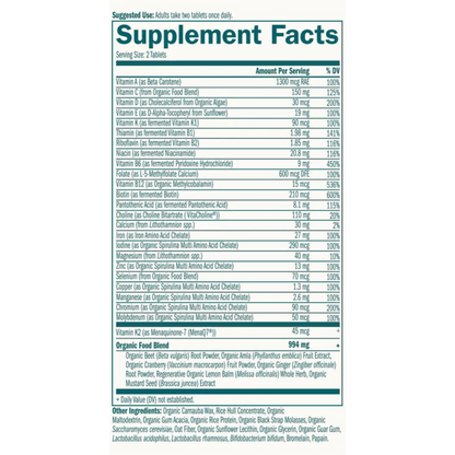 Vitamin A (as Beta Carotene), Vitamin C (from organic food blend), Vitamin D (as Cholecalciferol from Organic Algae), Vitamin E (as D-Alpha-Tocopheryl from Sunflower), Vitamin K (as fermented Vitamin K1), Thiamin (as fermented Vitamin B1), Riboflavin (as fermented Vitamin B2), Niacin (as fermented Niacinamide), Folate (as L-5-Methylfolate Calcium), Vitamin B6 (as fermented Pyridoxine Hydrochloride), Vitamin B12 (as Organic Methylcobalamin), Biotin (as fermented Biotin), Pantothenic Acid (as fermented Pantothenic Acid), Choline (as Choline Bitartrate (VitaCholine®)), Calcium (from Lithothamnion spp.) Iron (as Iron Amino Acid Chelate), Iodine (as Organic Spirulina Multi Amino Acid Chelate), Magnesium (from Lithothamnion spp.), Zinc (as Organic Spirulina Multi Amino Acid Chelate), Selenium (from Organic Food Blend), Manganese (as Organic Spirulina Multi Amino Acid Chelate), Copper (as Organic Spirulina Multi Amino Acid Chelate), Chromium (as Organic Spirulina Multi Amino Acid Chelate), Molybdenum (as Organic Spirulina Multi Amino Acid Chelate), Vitamin K2 (as Menaquinone-7 (MenaQ7®)), Organic Food Blend: Organic Beet (Beta vulgaris) Root Powder, Organic Amla (Phyllanthus emblica) Fruit Extract, Organic Cranberry (Vaccinium macrocarpon) Fruit Powder, Organic Ginger (Zingiber officinale) Root Powder, Regenerative Organic Lemon Balm (Melissa officinalis) Whole Herb, Organic, Mustard Seed (Brassica juncea) Extract