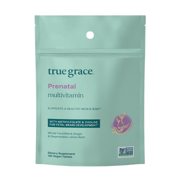 Choline plays a structural role in the brain and is essential for the development of the brain and spinal cord. It also helps support memory and mood. True Grace Prenatal Multivitamin is an excellent source of Choline.