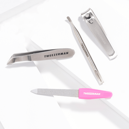 Keep this essentials kit right at your fingertips in a pocket or purse for any time your nails hit a snag and require a quick fix. It provides fast relief for hangnails, chips, and breaks anytime, anywhere. Kit includes:- Stainless Steel Fingernail Clipper: Use the ultra-sharp blades to easily trim fingernails with precision- Stainless Mini Pushy + Nail Cleaner: Gently push back cuticles and clean under the nail- Stainless Mini Cuticle + Hangnail Nipper: For easy, comfortable handling, the sharp, angled blades cleanly cut cuticles and hangnails without pulling on skin ? just squeeze to snip, that's it- Pocket Nail File: With a strong, long-lasting sapphire finish, use the nickel-plated Pocket Nail File for gentle shaping and smoothing of nails