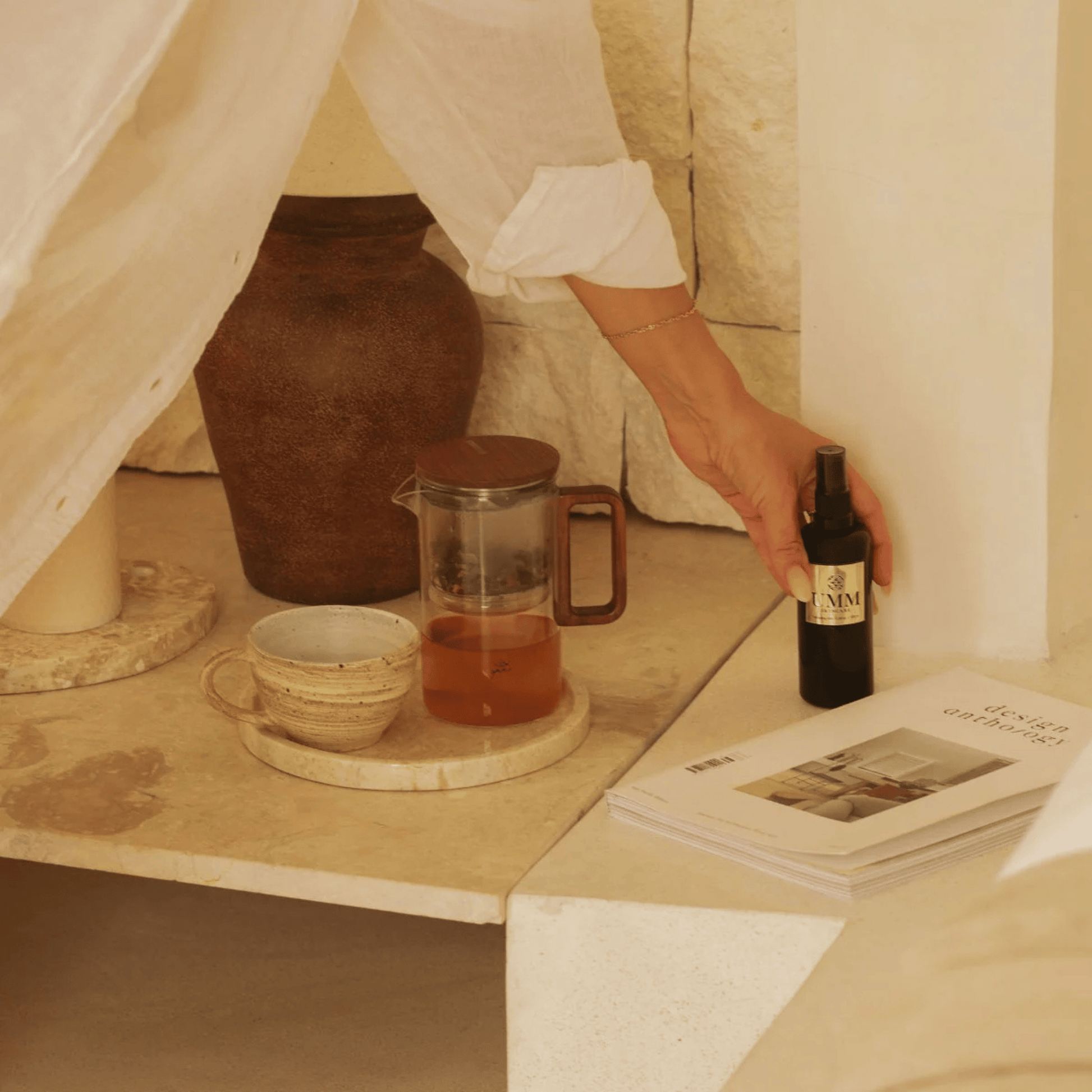 1: Spritz the mist over your body and face after showering, then apply Body Creme + Elixir for enhanced hydration.