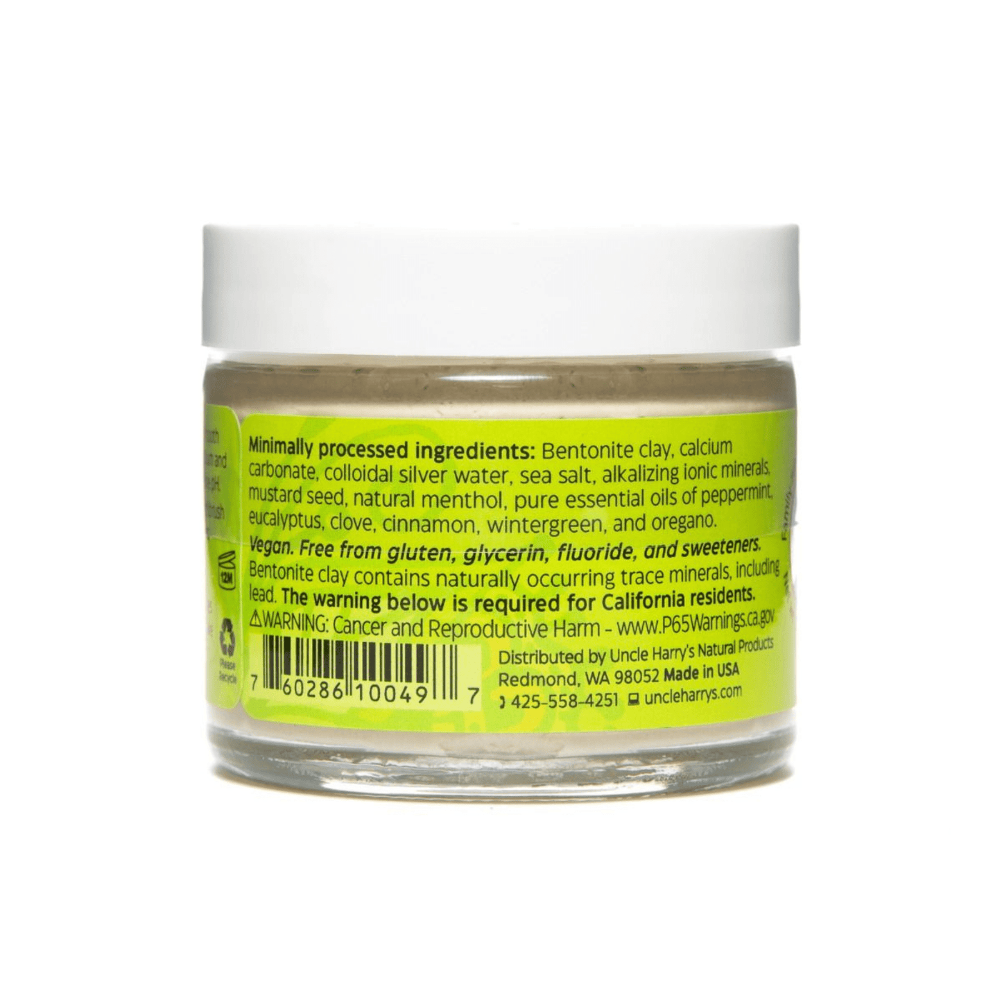 Minimally processed ingredients: Purified water, bentonite clay, calcium carbonate, sea salt, alkalizing ionic minerals, mustard seed powder, natural menthol (Mentha arvensis), essential oils of peppermint (Mentha piperita), eucalyptus (Eucalyptus globulus), clove bud (Eugenia caryophyllus), cinnamon (Cinnamomum cassia), wintergreen (Gaultheria procumbens), and wild oregano (Origanum vulgare).
