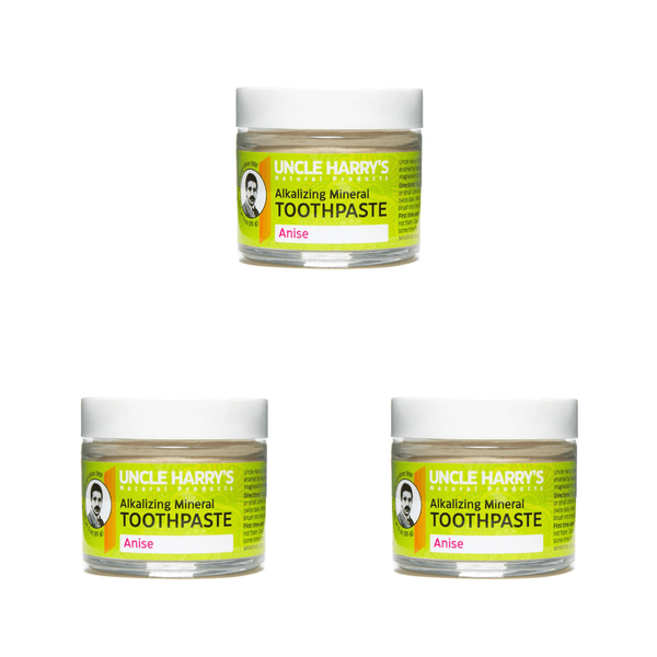 Clean and alkalize with daily brushing. Uncle Harry’s Toothpaste encourages remineralization of tooth enamel by neutralizing acids and bacteria, supplying calcium and magnesium to strengthen teeth, and promoting an alkaline pH. Now in a convenient 3 pack! Each glass jar is 3 ounces. Packaging my vary.