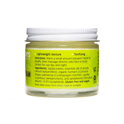 This lightweight moisturizer combines silky smooth jojoba esters and traditional Ayurvedic extracts for a naturally refreshing, fast-penetrating cream. Jojoba helps lock in moisture and keep skin feeling hydrated and soft. Turmeric and sandalwood are soothing oils, while palmarosa and cypress are known for their invigorating and tonifying properties.