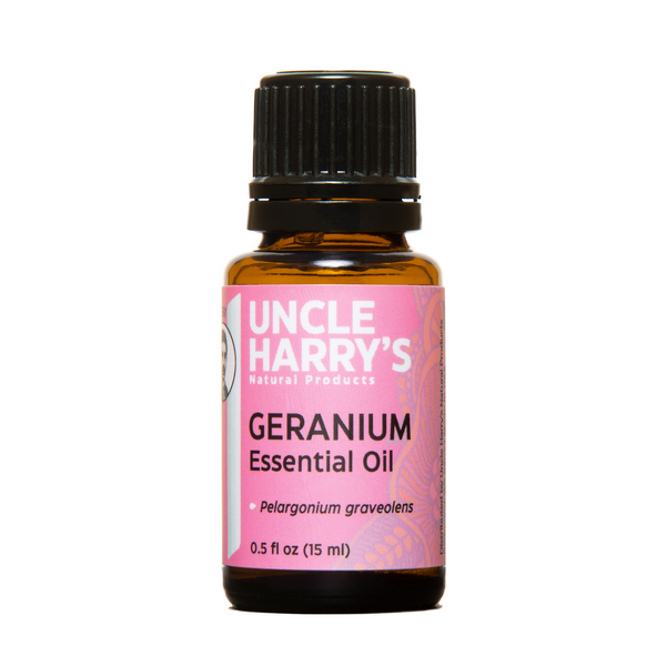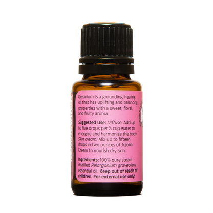 Geranium is a grounding, healing oil that has uplifting and balancing properties with a sweet, floral, and fruity aroma. It blends well with Rose, Lavender, Neroli, and Patchouli.